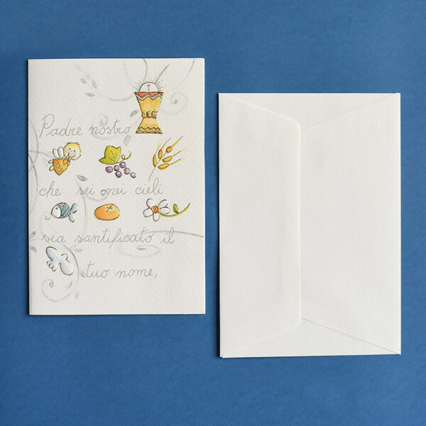 Immaginetta Comunione in carta Natural Evolution 200 gr. con stampa offset, rilievi a secco e oro a caldo. La copertina presenta l’inizio del Padre Nostro, accompagnato dai simboli sacri della Prima Comunione, per un ricordo intriso di significato spirituale e bellezza.