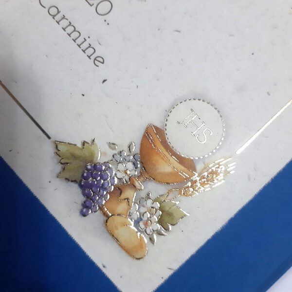 L’immaginetta Comunione, l’invito e la fascetta sono realizzati in carta Flora 200 gr. con stampa offset e decorata con rilievi e oro a caldo. La tasca è in cartoncino verde oliva 270 gr.Â
