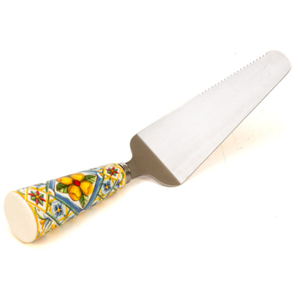 Palatorta in metallo con manico in ceramica decorato con una fantasia che richiama i colori caldi del mare e del sole italiani. Grazie alla sua parte seghettata, è ideale per tagliare e servire comodamente una fetta di dolce. E’ ideale come bomboniera matrimonio.